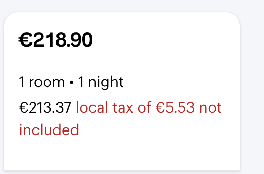 - If it is to be paid on-site, the exact amount will be shown during your booking, and you will need to pay it at the hotel during your stay (example below 👇). If the tax is to be paid directly to the hotel, it will not be included in your company's travel policy.