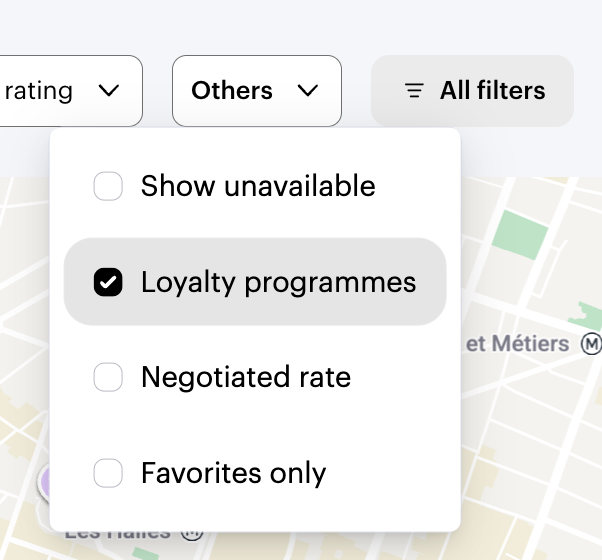 To ensure you choose a hotel eligible for the Accor All/ Accor All Plus programme, you can click on Others and use the Loyalty Programmes filter. This filter will allow you to display only the hotels participating in the programme, so you can enjoy your loyalty benefits.