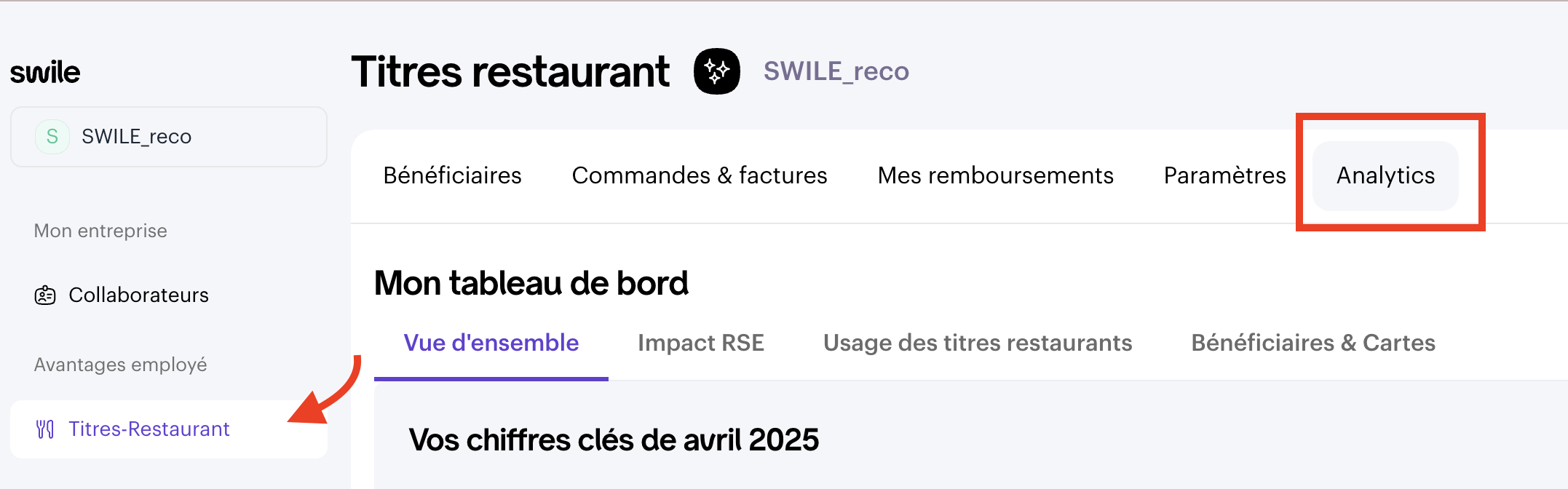 To access your meal voucher statistics, go to your meal voucher admin area and click on Analytics.