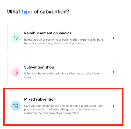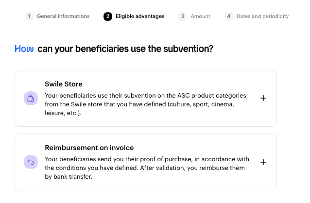 - By clicking on "Swile Shop", you can add the categories and/or products from the shop you want to subsidise.