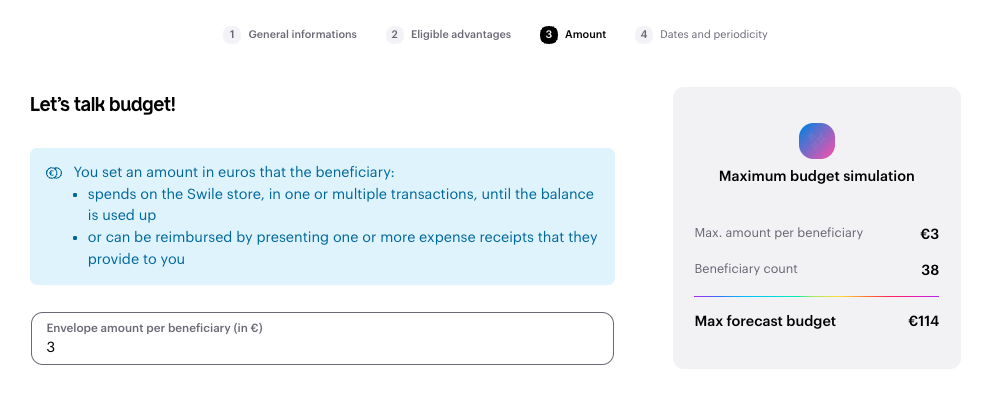 Enter the amount in euros that each recipient can spend in the shop and/or claim back with a receipt.