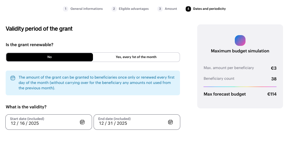 🔍 You can see the maximum estimated budget live in the box on the right. This is the maximum if 100% of recipients use 100% of their grants.