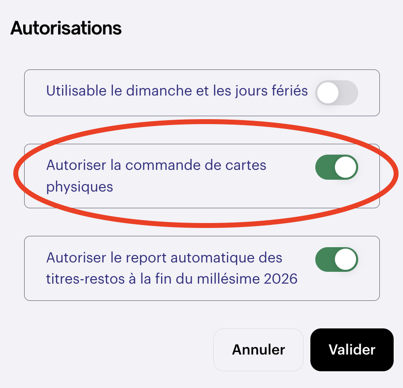 By default, the option to order a physical card is enabled for all recipients with meal vouchers. As an administrator, you can restrict this option in your settings by disabling the ability to order physical cards for all your employees:
