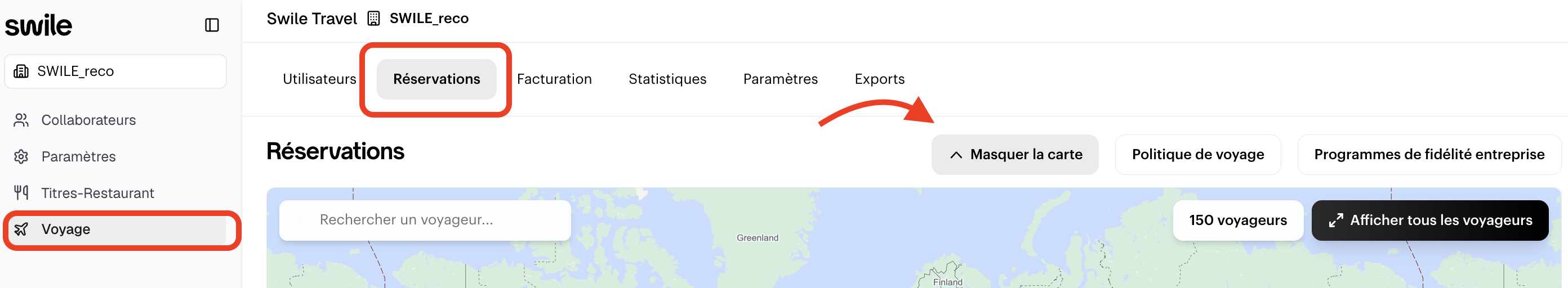 As a Swile Travel administrator, you have access to an interactive map that lets you see at a glance where your colleagues currently travelling are located.