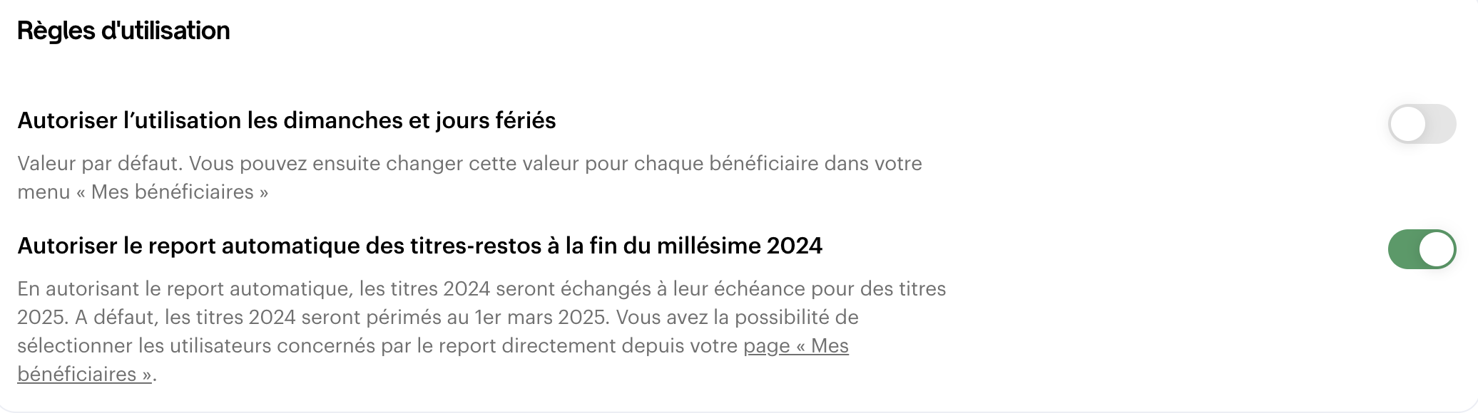 - Automatic carry-over of meal vouchers at the end of the year. By default, this option is enabled. Your beneficiaries' meal vouchers will automatically be carried over to the next calendar year. You can disable this if needed. For more information, see: Meal voucher validity period (automatic carry-over)
