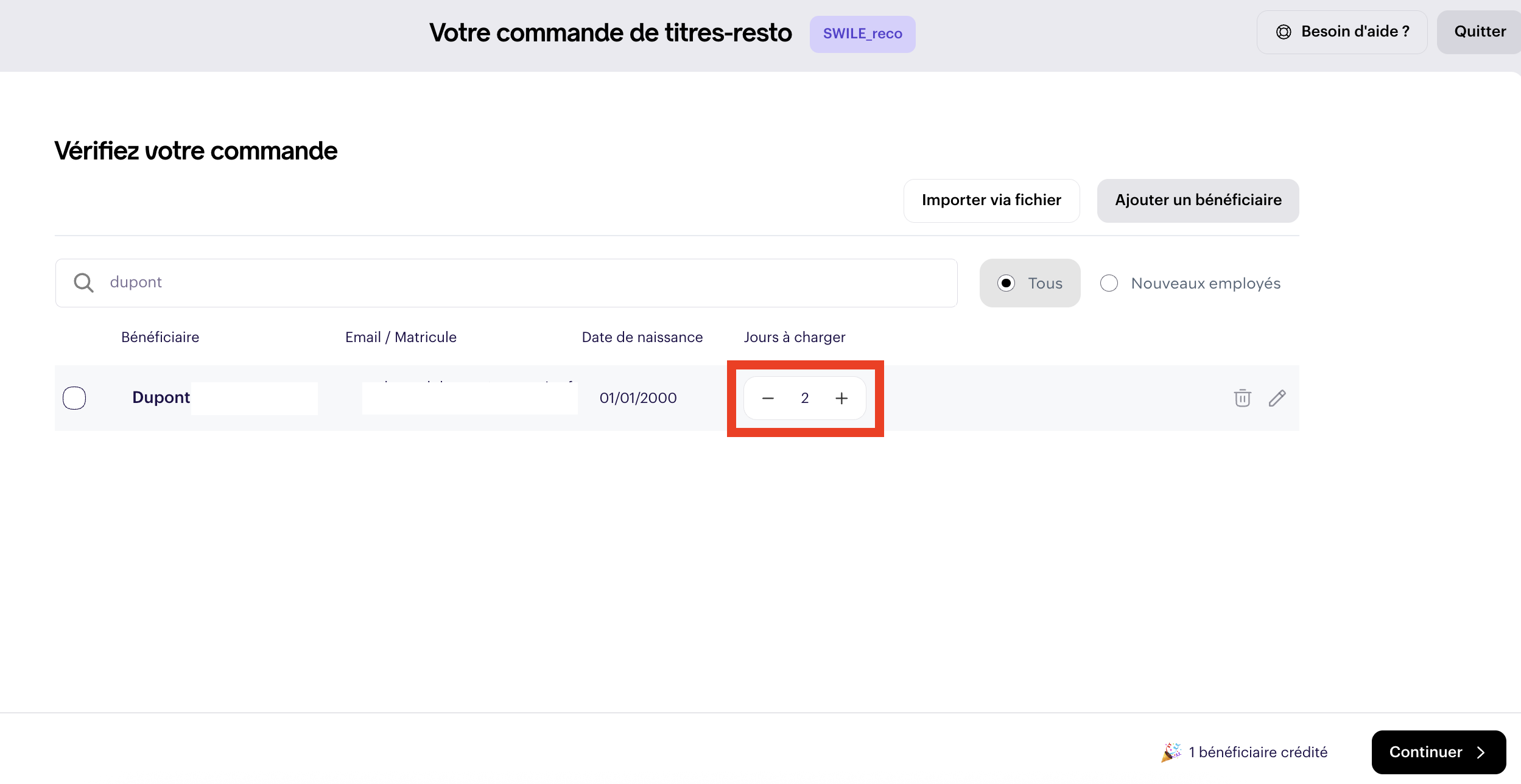 - Enter the amount to credit for each beneficiary. As a reminder, here's how to determine the amount to credit: How to calculate the number of meal vouchers to credit for my employees?
