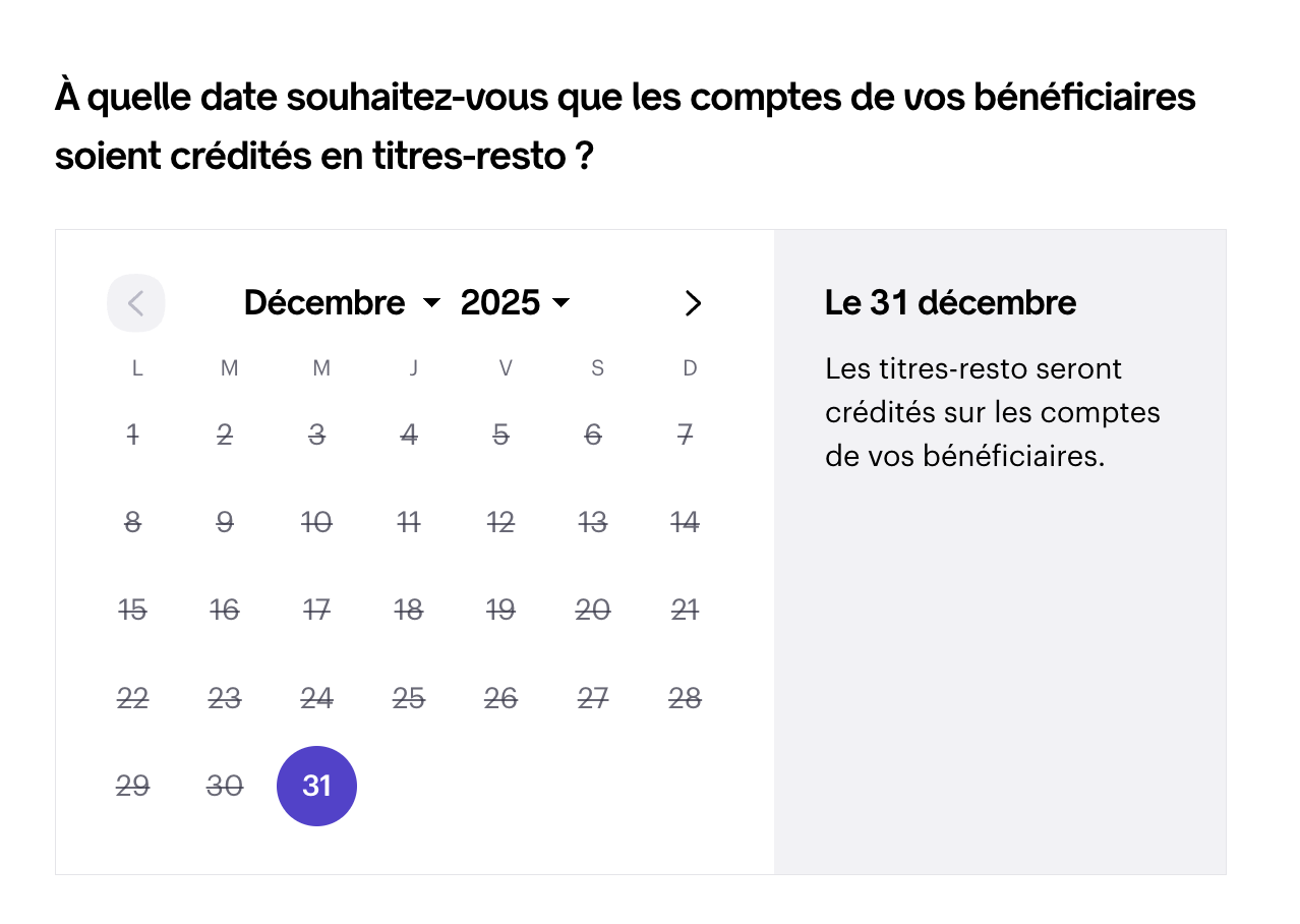 - Choose the date you want your meal vouchers to be available on your beneficiaries' accounts.