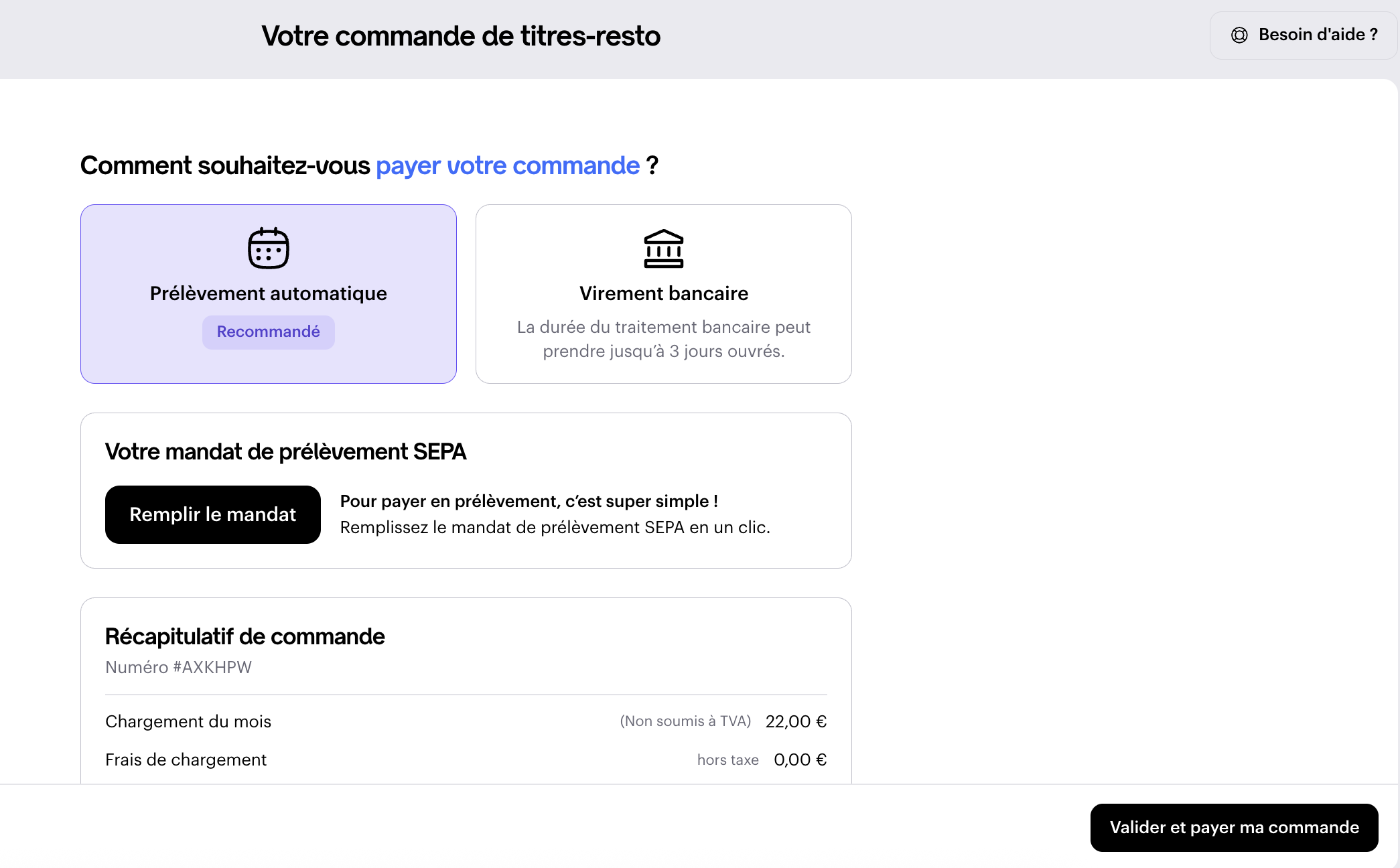 - Choose your payment method. 💡 The very first meal voucher order must be paid by bank transfer. For your second order, you can pay by direct debit. For more information, see: Add a direct debit mandate to pay for meal voucher orders. It is not possible to pay for a meal voucher order by credit card.