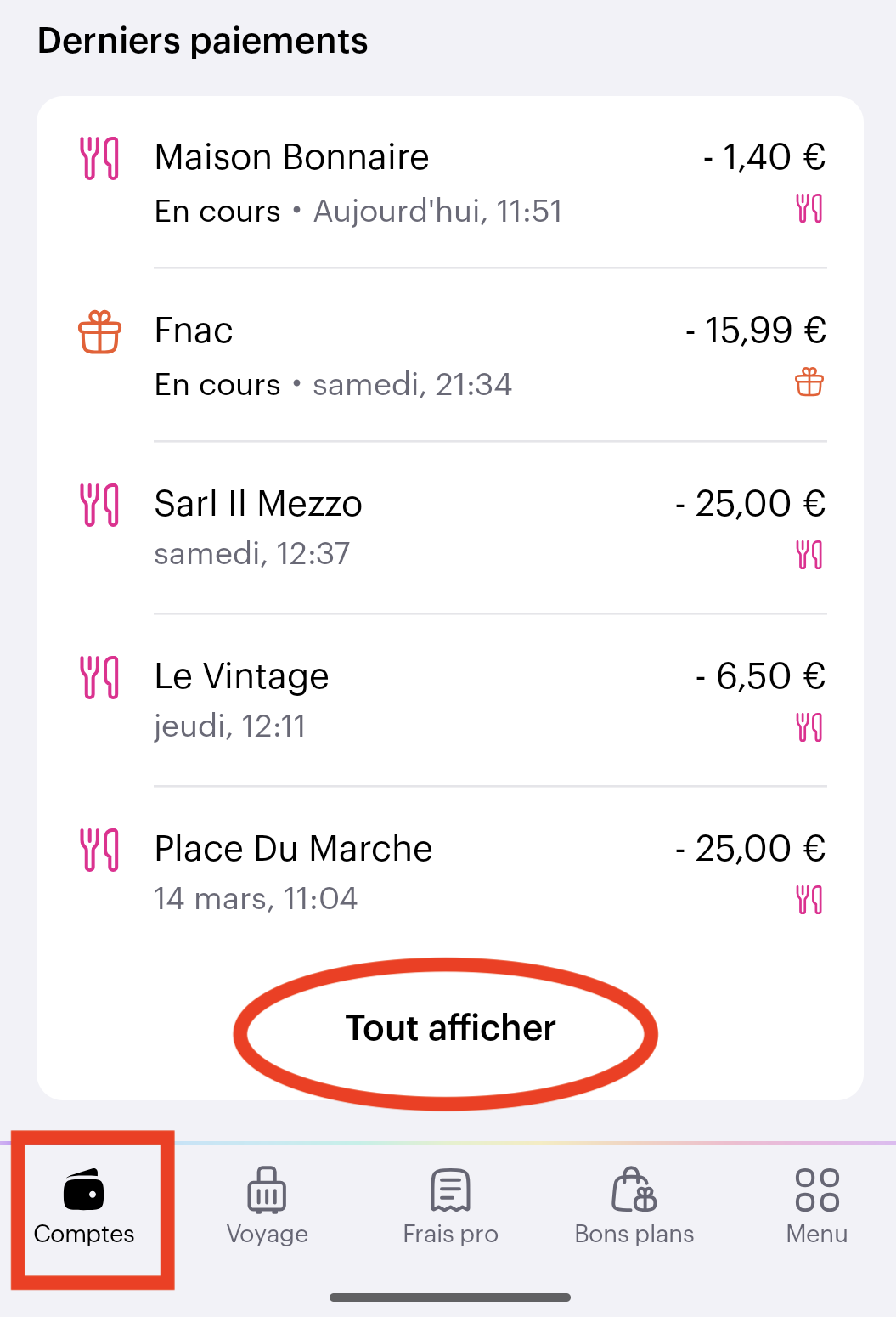 Go to your Swile account in the "Accounts" menu to view your history. On the mobile app, tap "Show all".