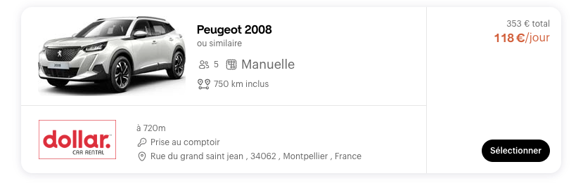 For example: You select the Peugeot 2008 model as shown in the photo below. When you pick up your car, you'll either get a Peugeot 2008 or a similar model (Ford Puma, Renault Captur, etc.).