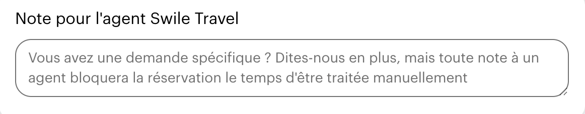 Choisissez le vol qui vous convient sur Swile Travel, et sur la page de confirmation, juste avant de réserver, remplissez l'encart "Note pour l'agent Swile Travel" avec votre demande spécifique 👇