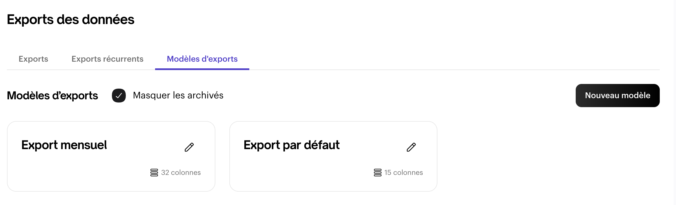Dans Modèles d'export, cliquez sur Nouveau modèle. Vous pouvez créer et personnaliser votre propre modèle d'export en fonction de vos besoins (exemple du modèle "Export mensuel").