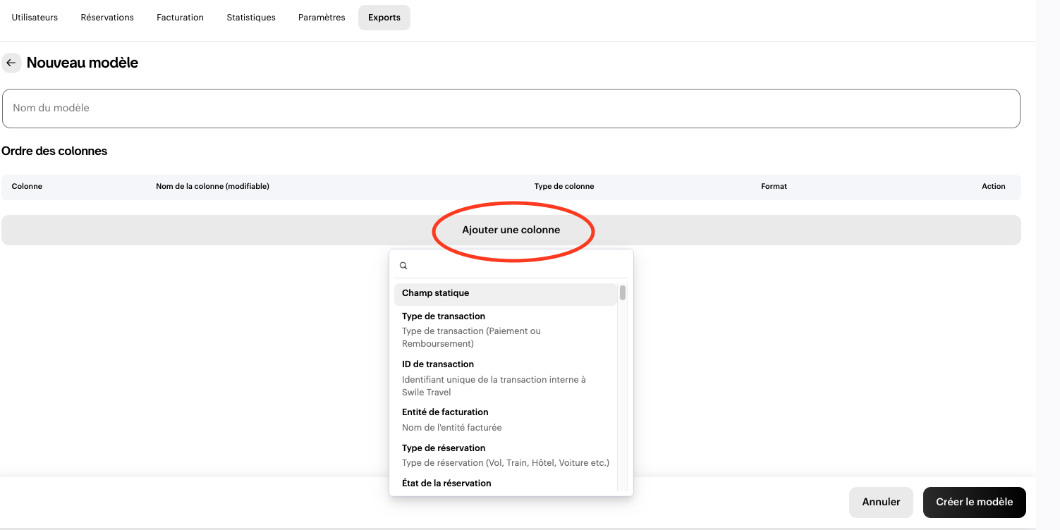 Cliquez sur Ajouter une colonne pour retrouver les champs connus sur Swile Travel.
