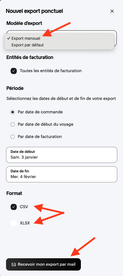 choisir la période voulue, et les dates à cibler : soit par date de commande, date de début de voyage ou date de facturation