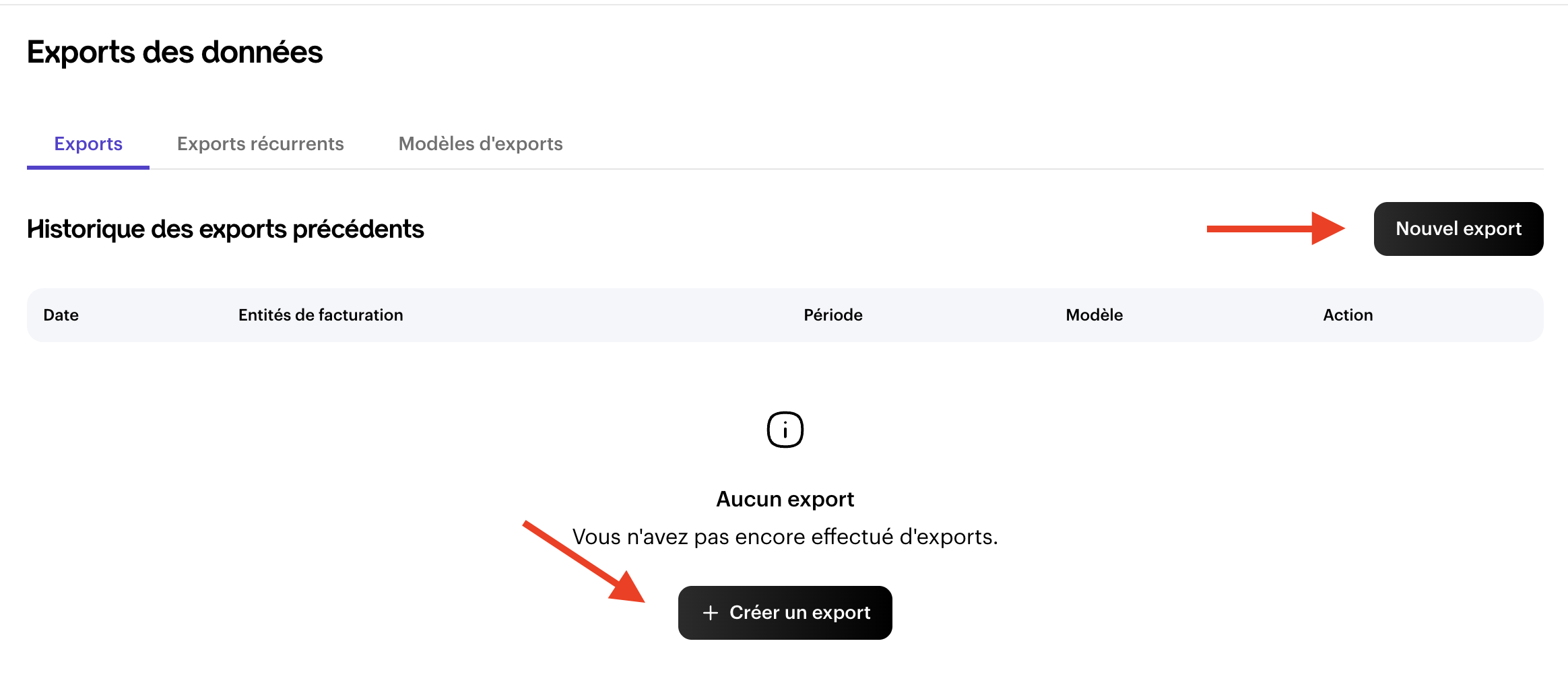Si vous n'avez jamais créé d'exports auparavant, cliquez sur Créer un export sinon allez sur Nouvel export.