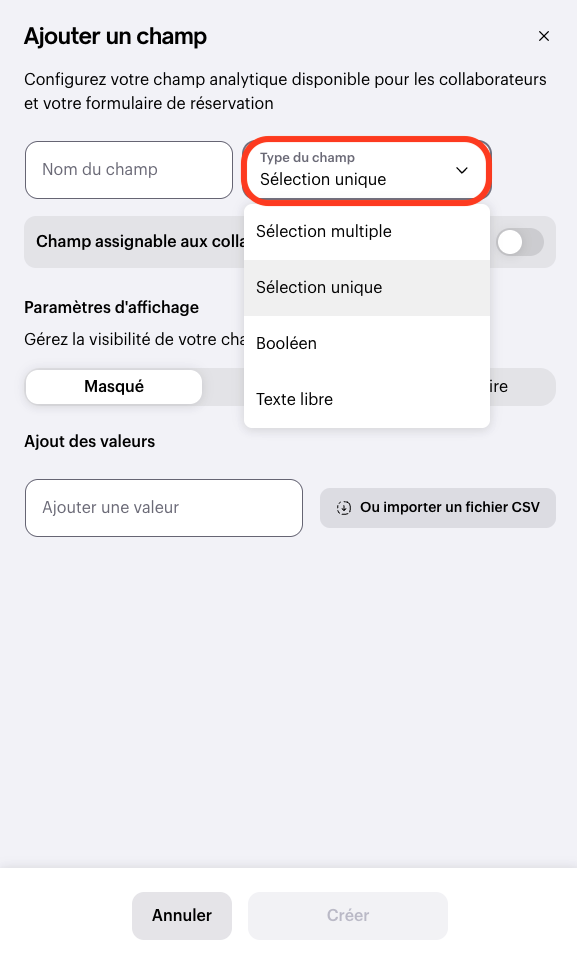 - Dans Type du champ : Choisissez s'il doit être multiple, unique, booléen (vrai/faux) ou en texte libre.