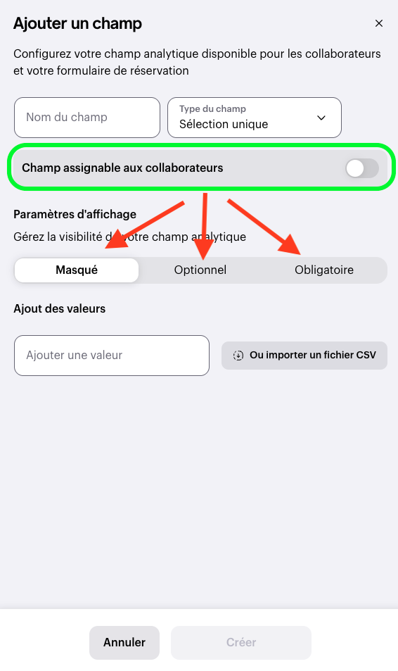 - Ajustez le champ assignable aux collaborateurs selon vos besoins :