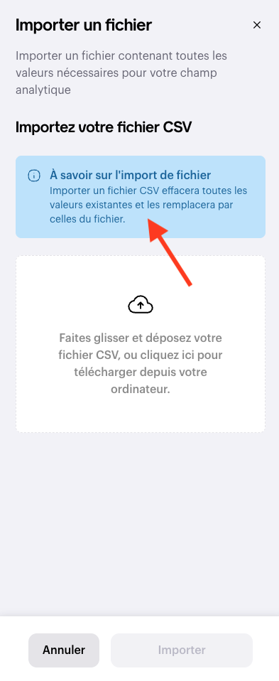 ⚠️ Attention : Lorsque vous importez un CSV pour modification, il écrase par défaut toutes les valeurs existantes. Veillez à bien reprendre toutes les valeurs, même celles que vous souhaitez conserver.