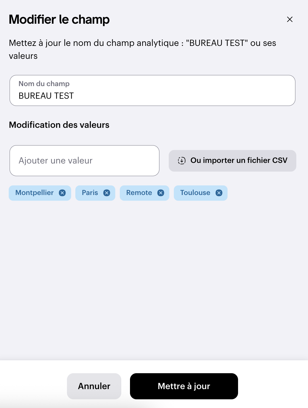 Vous pouvez modifier les valeurs manuellement (une à une) ou en masse via un fichier CSV.