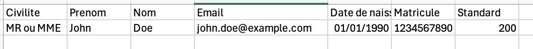 - Les collaborateurs qui ont déjà été créés sur Services à la personne apparaissent dans le fichier. Remplissez simplement la colonne pour renseigner le montant à allouer (dans l'exemple en image, la dotation s'appelle Standard - sur votre fichier, vous retrouverez le nom de votre propre dotation).