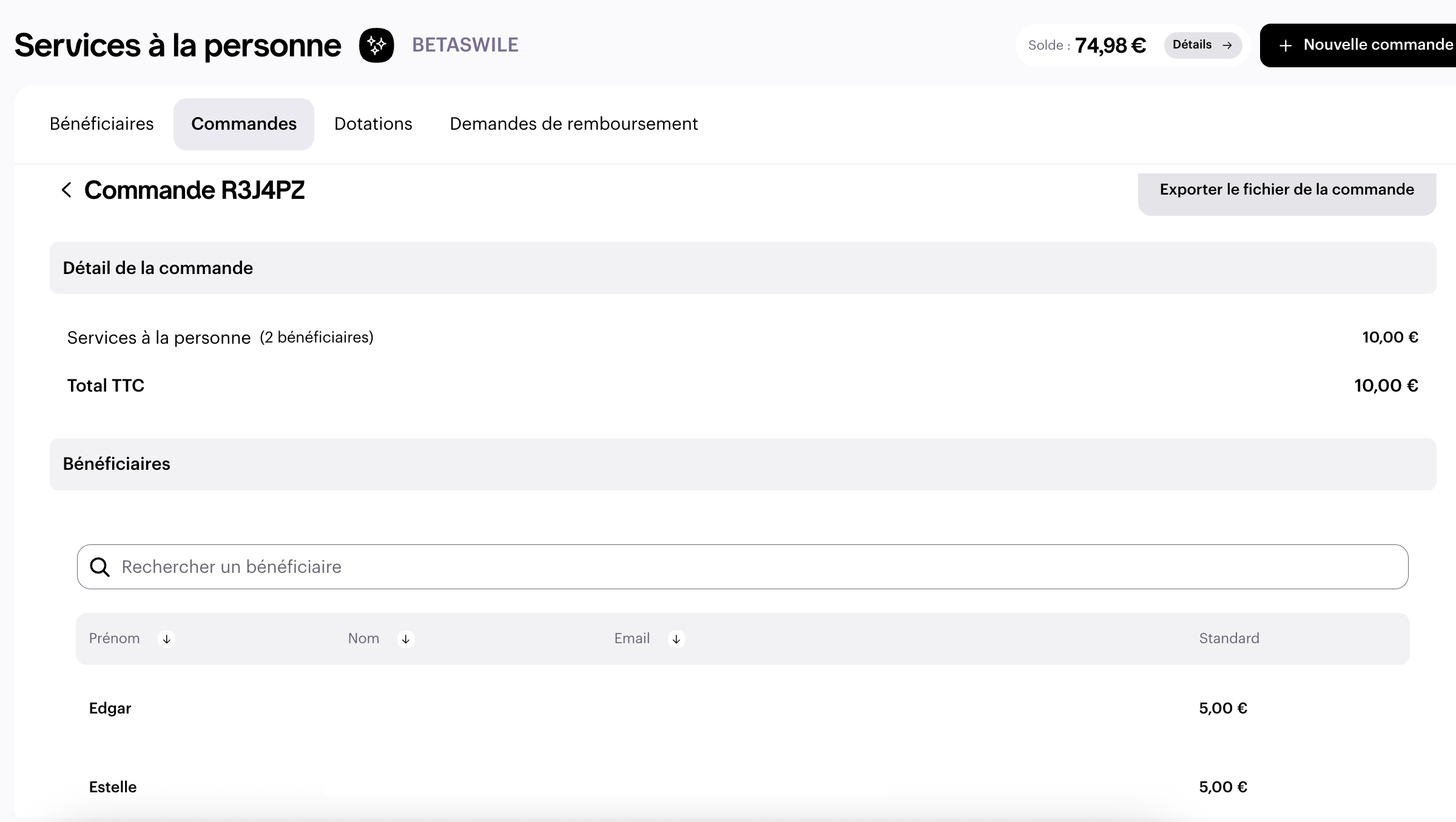 Date de la commande : Date à laquelle vos salariés recevront leurs avantages Services à la personne