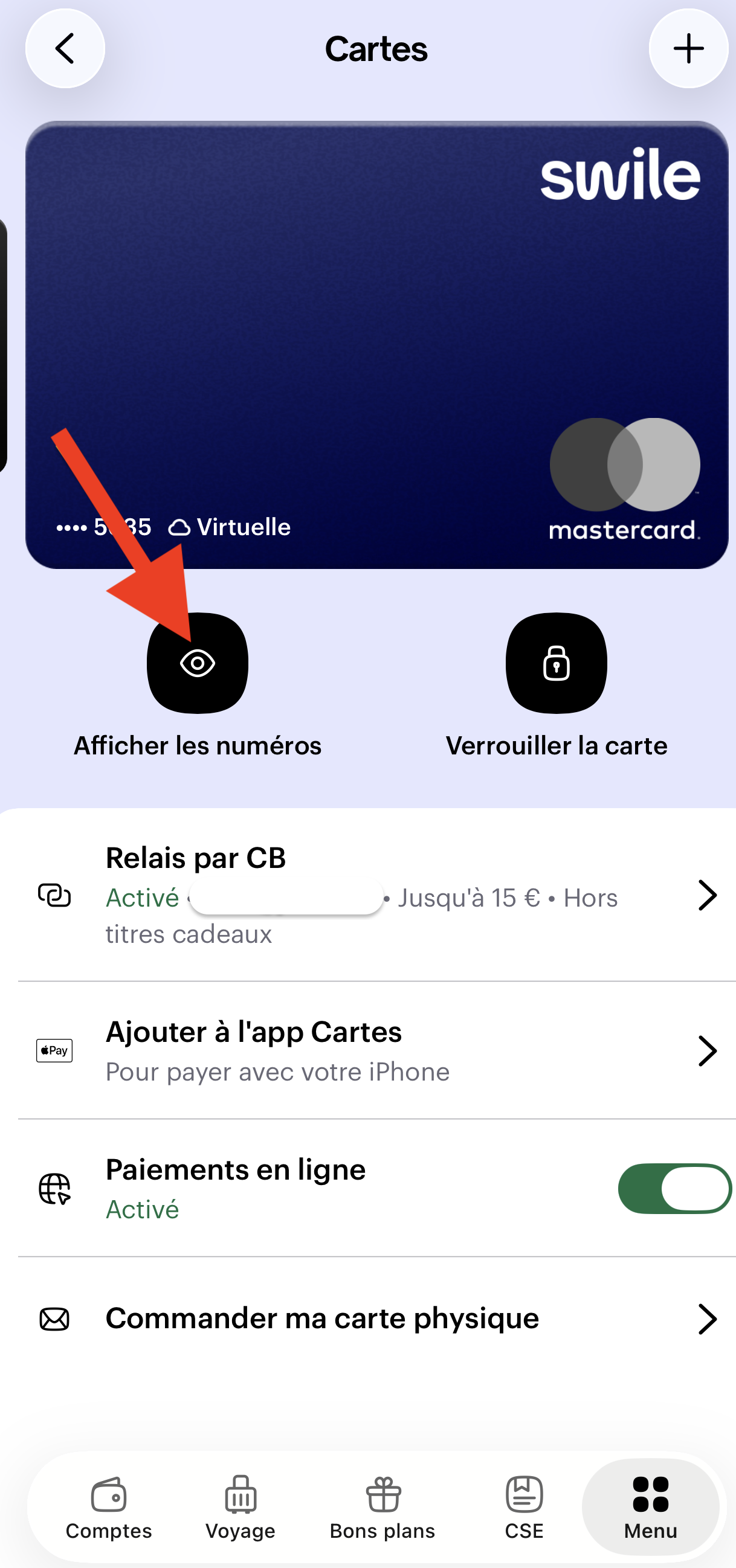 - Cliquez sur le bouton "Cartes" dans votre compte Swile ("Menu" > "Cartes")