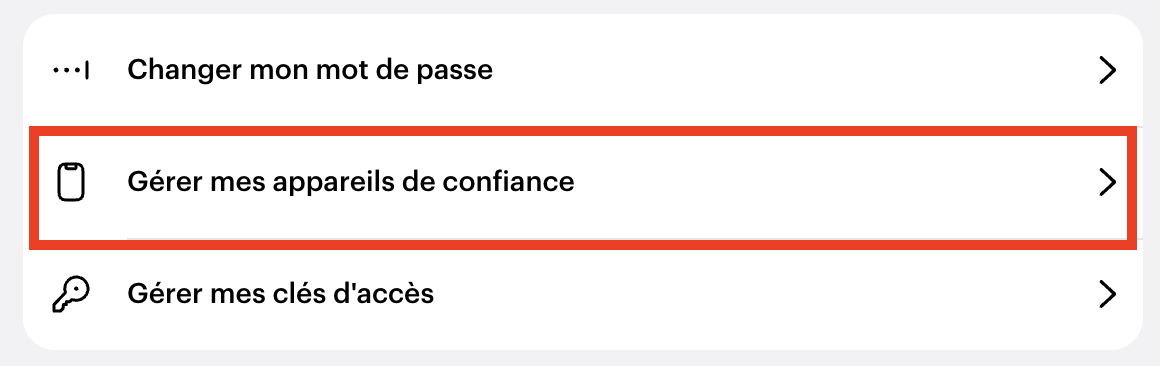 - Vous retrouvez ici tous vos appareils de confiance enregistrés. Pour en supprimer un, cliquez dessus puis sur Retirer l'appareil de confiance.