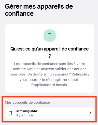 Chez Swile, la sécurité de votre compte est notre priorité. Vous pouvez à tout moment consulter la liste de vos appareils de confiance enregistrés et en supprimer si nécessaire, directement depuis votre compte Swile.