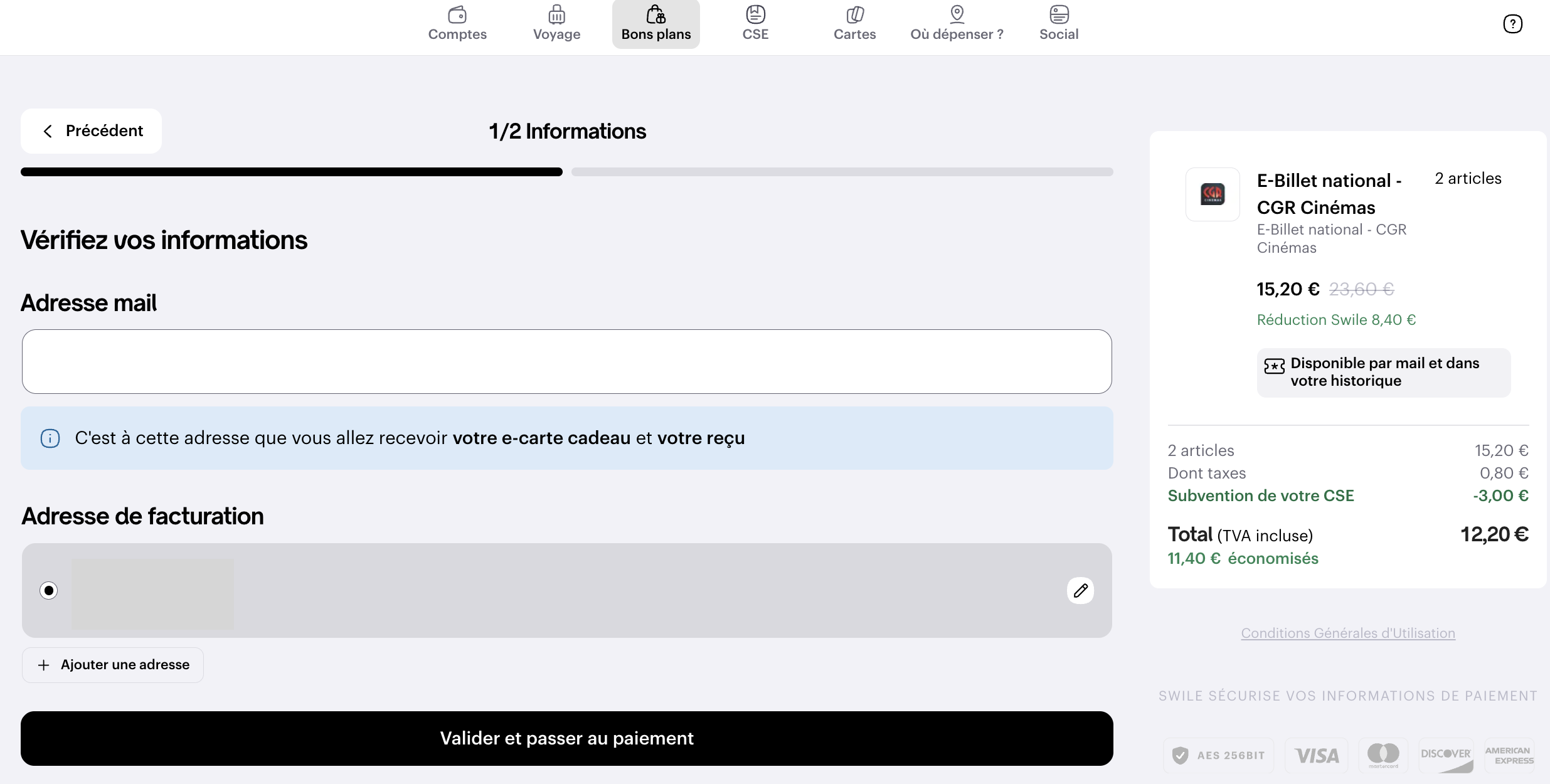 Lorsque vous accédez à votre panier, vous pouvez visualiser le montant subventionné par votre CSE / entreprise.