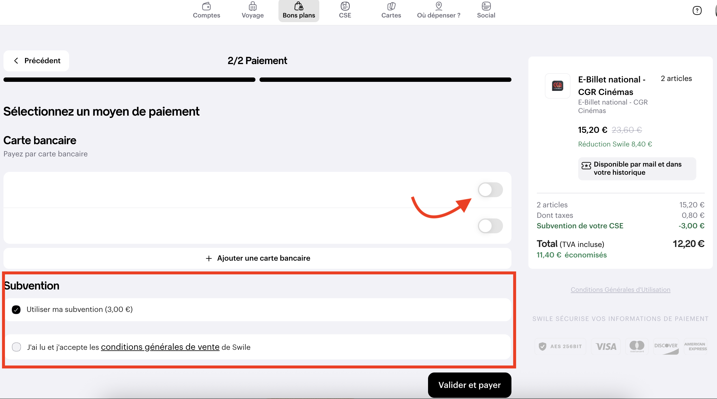Complétez le paiement en carte bancaire si besoin. 💡 À cette étape, vous pourrez choisir de ne pas appliquer la subvention (si vous voulez l'utiliser sur un prochain achat par exemple) en décochant Utiliser ma subvention.
