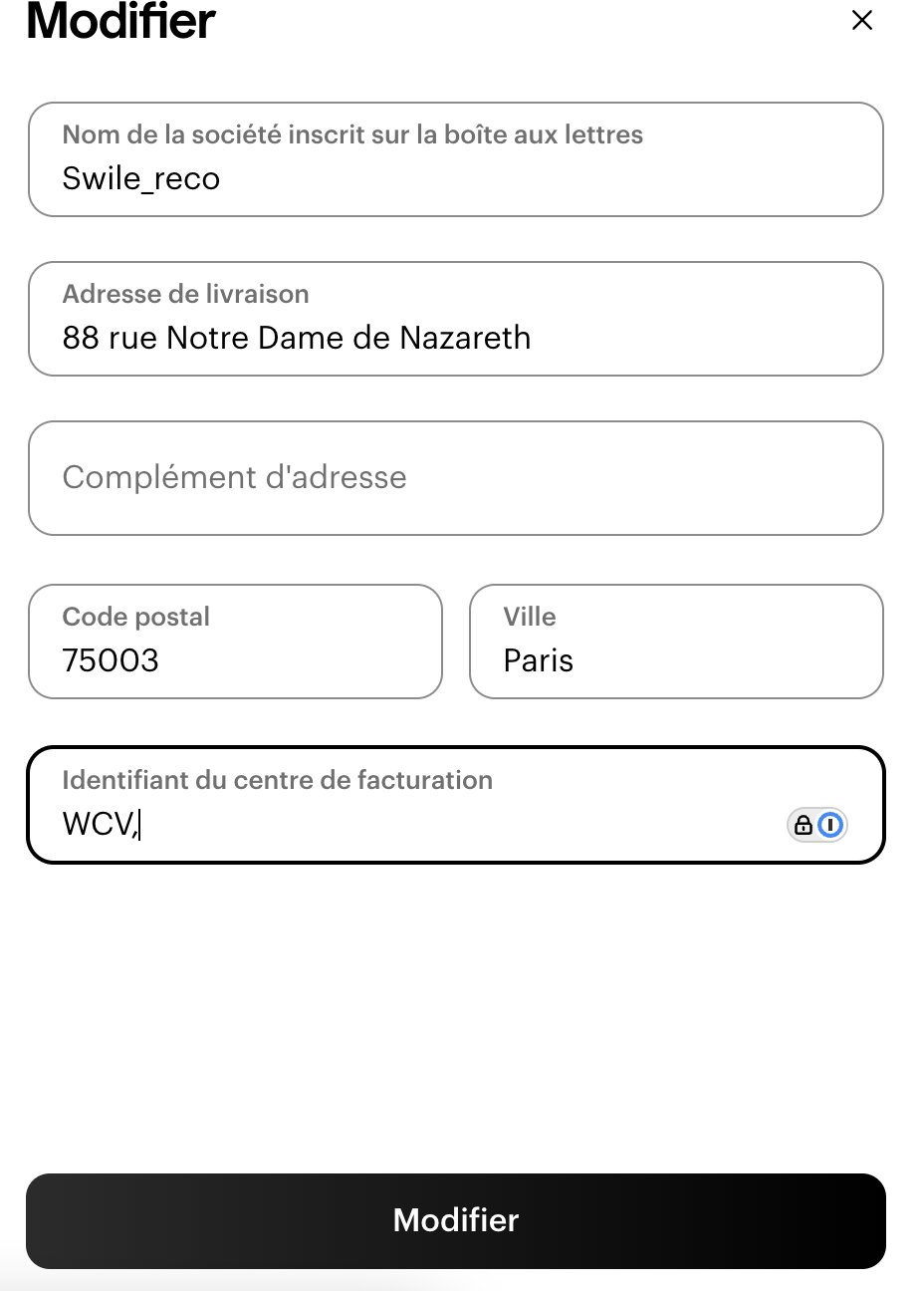 - Cliquez sur Modifier et renseignez votre nouvelle adresse de facturation.