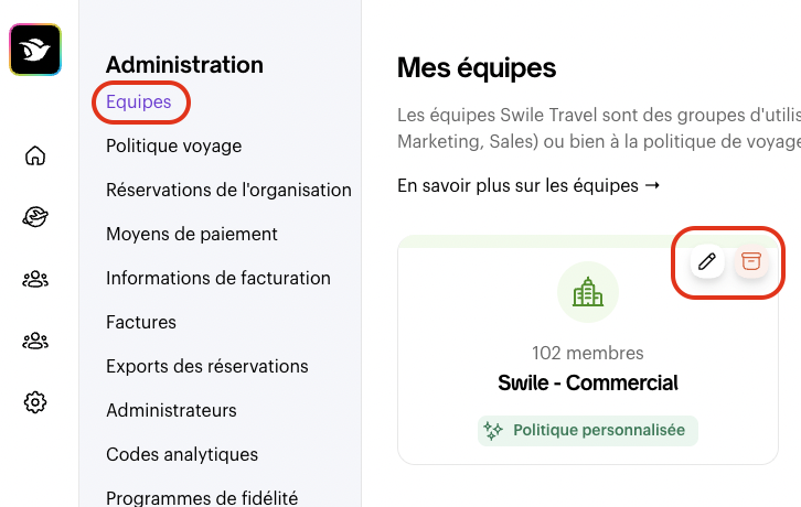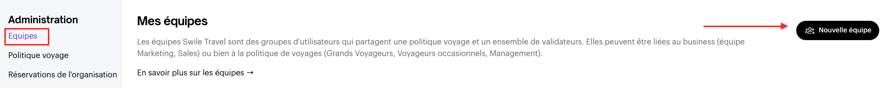 Les équipes sont des groupes d'utilisateurs qui partagent une politique voyage et un ensemble de validateurs. Cliquez sur l'action que vous souhaitez faire pour en savoir plus 👇