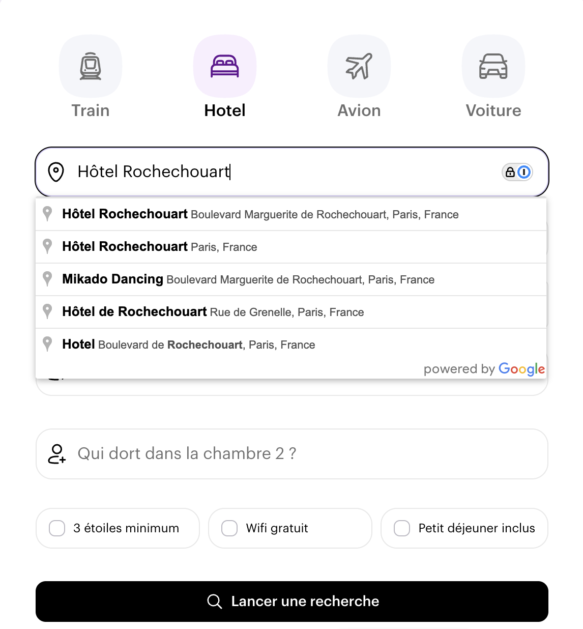 Pour lancer la recherche, inscrivez le nom de l'hôtel (ou l'adresse exacte de votre rendez-vous afin de trouver les hôtels les plus proches). Cliquez sur l'hôtel ou le lieu souhaité dans la liste déroulante pour confirmer votre destination.