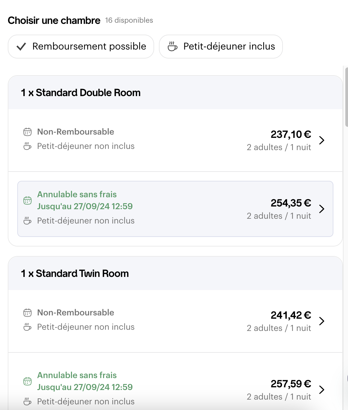 Après avoir cliqué sur voir les chambres, l'ensemble des offres disponibles dans l'hôtel que vous avez choisi va s'afficher :