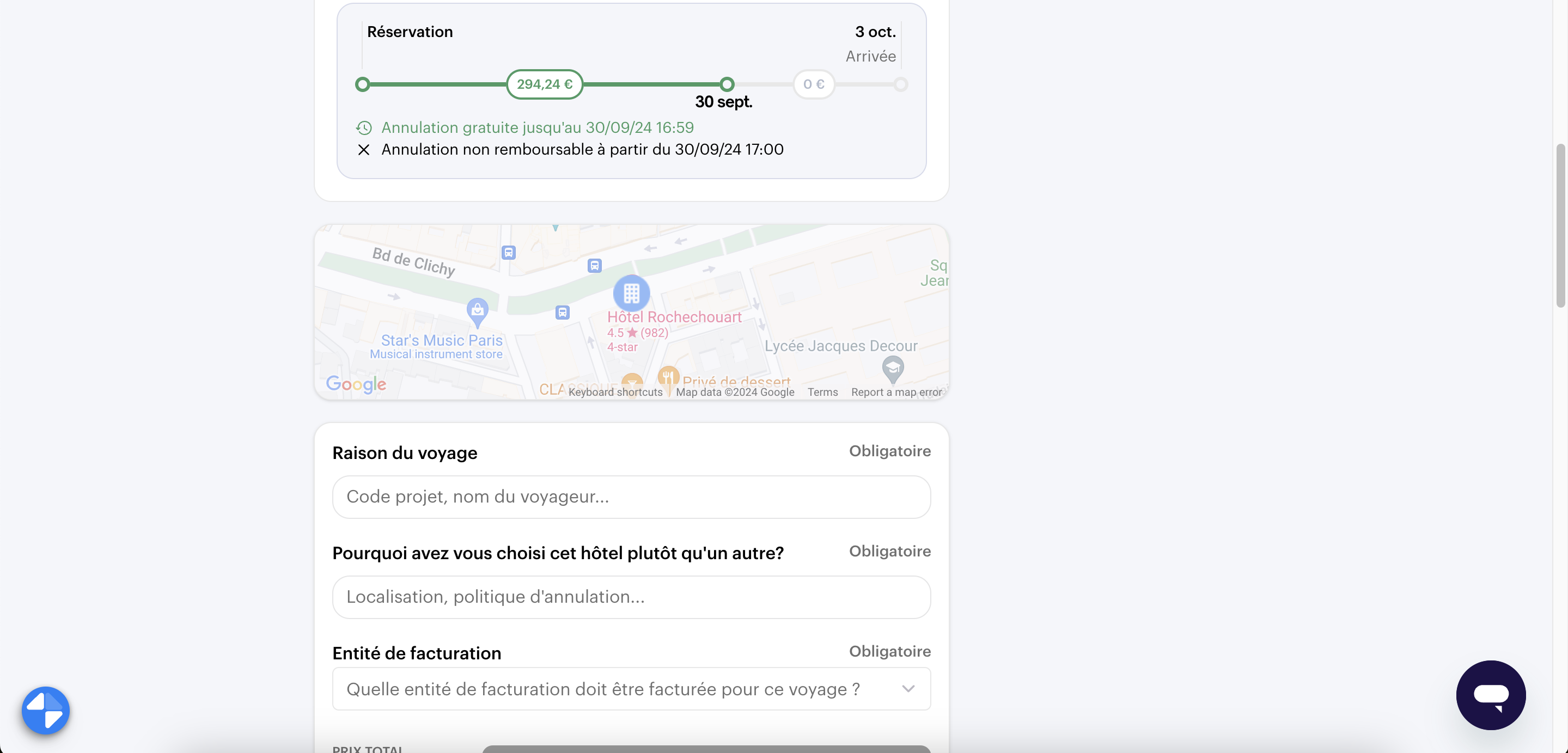 Remplissez la raison du voyage / du choix de l'hôtel et l'entité de facturation :