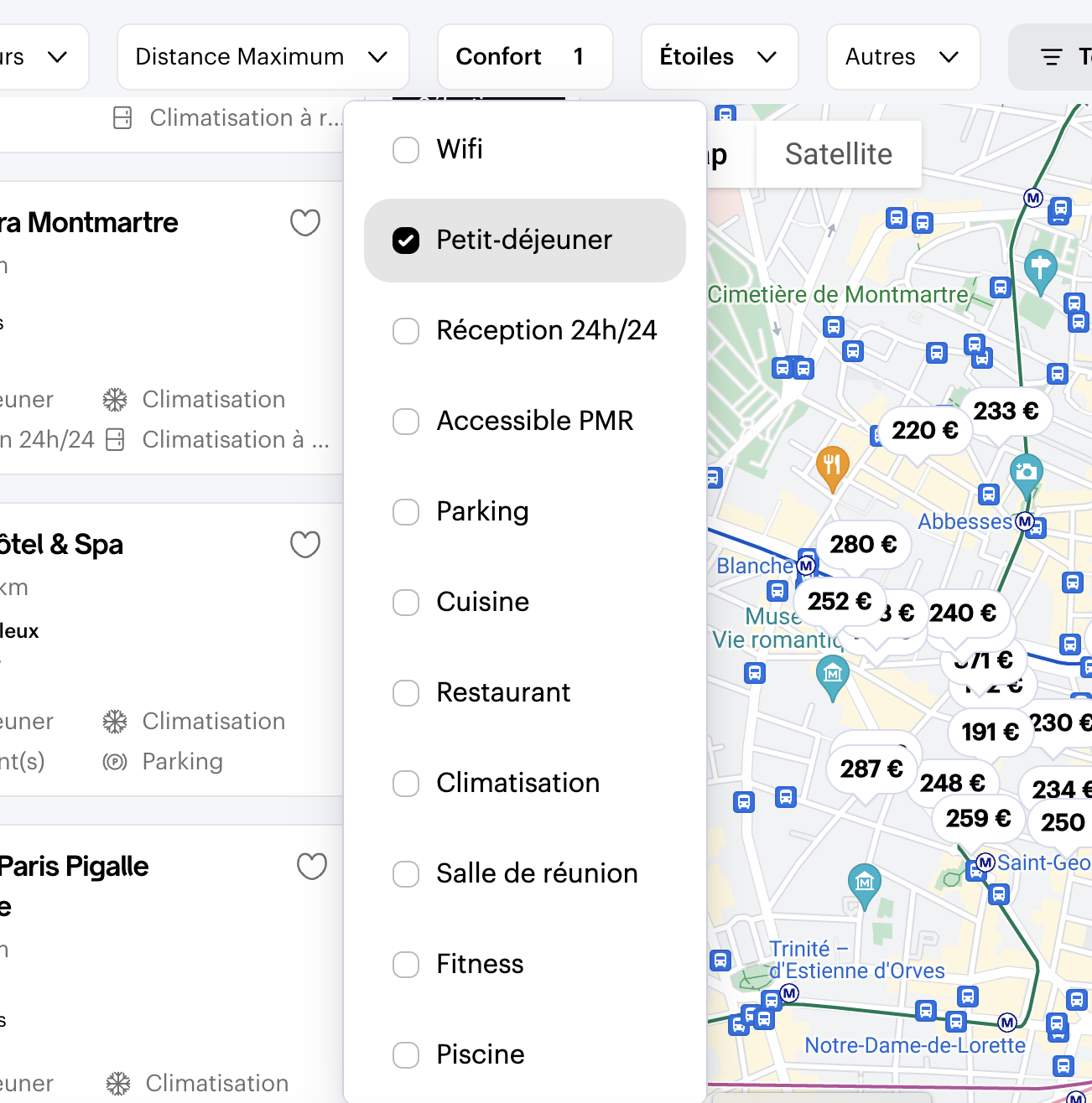 via les cases de catégories de confort : wifi, petit-déjeuner, restaurant.
