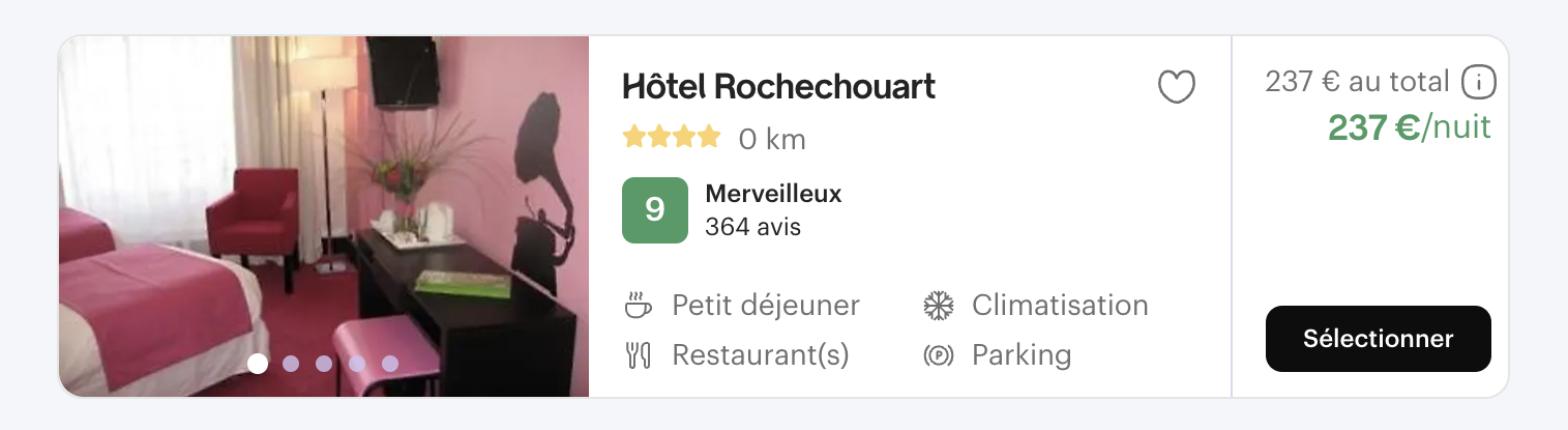 Les prix affichés sont les premiers prix des chambres de chaque hôtel, pour une nuit (alors, si vous aviez lancé une recherche pour plusieurs nuits ou pour plusieurs personnes, ne soyez pas surpris(e) une fois arrivé(e) au récapitulatif de paiement : la somme sera forcément plus élevée).