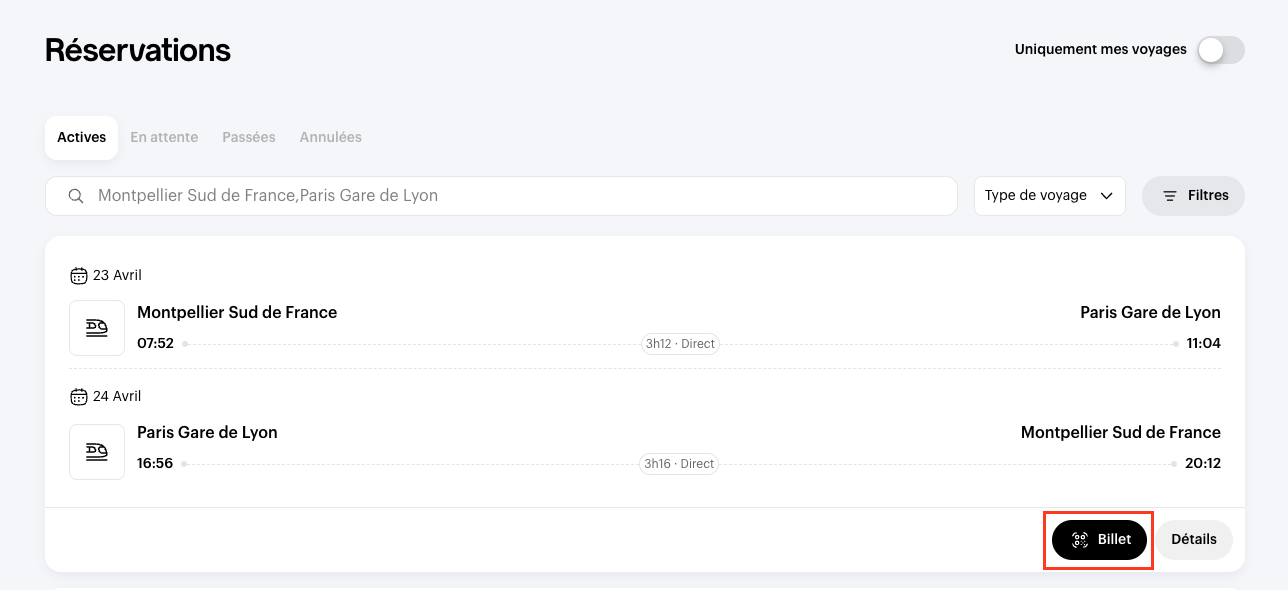 - Allez sur l'onglet Mes réservations > cliquez sur Actives